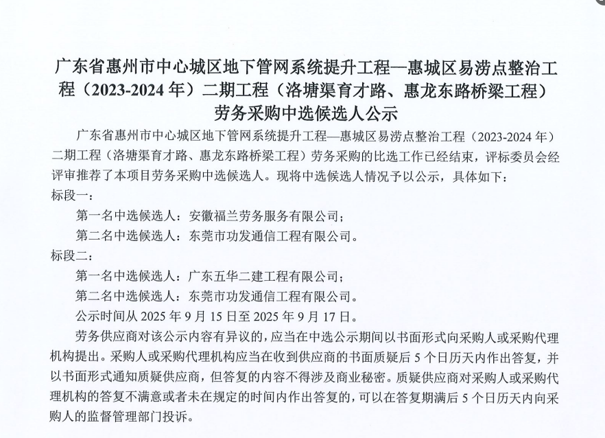 惠州市增江龍門段治理工程施工(一標段)勞務(wù)采購中選候選人公示……